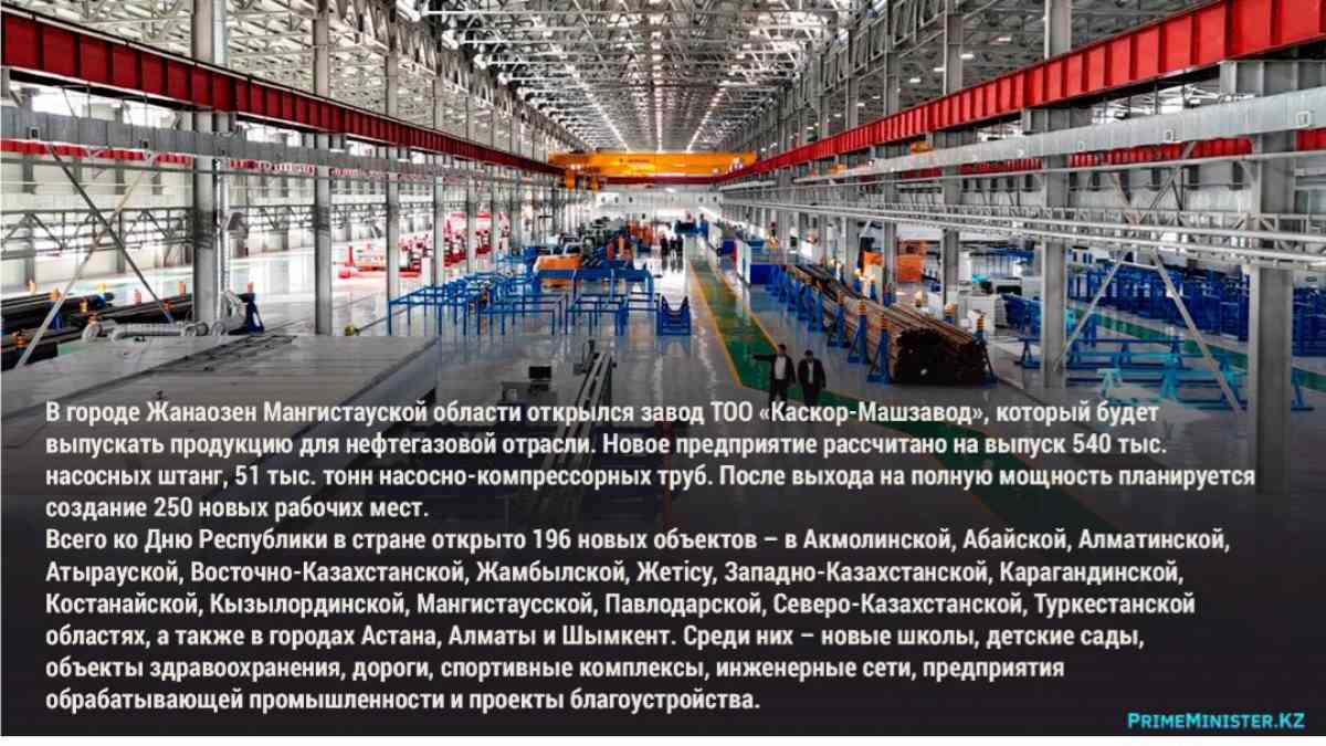 Ко Дню Республики по всей стране вводятся в эксплуатацию 196 новых объектов – от крупных промышленных предприятий до социальных, спортивных и инфраструктурных проектов. Все они реализованы в рамках исполнения поручений Главы государства Касым-Жомарта Токаева, направленных на повышения качества жизни населения и развития регионов.